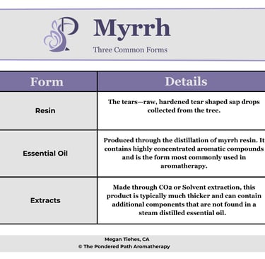 In modern aromatherapy use, myrrh is most often encountered in three primary forms. While they all come from the same plant source, they differ in how they are produced and in the type of product that results.